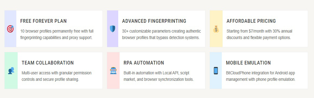BitBrowser represents exceptional value in the antidetect browser market, combining comprehensive functionality with aggressive pricing. While it may lack some of the polish found in premium competitors, the platform delivers all essential features required for professional multi-account management. The generous free tier, affordable paid plans, and unique features like BitCloudPhone mobile emulation make it particularly attractive for budget-conscious professionals and growing businesses.